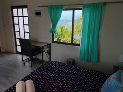 Bedroom with a queen bed, stunning sunrise and sunset views, and a dedicated workspace with a desk and ergonomic chair — perfect for remote work or quiet moments.